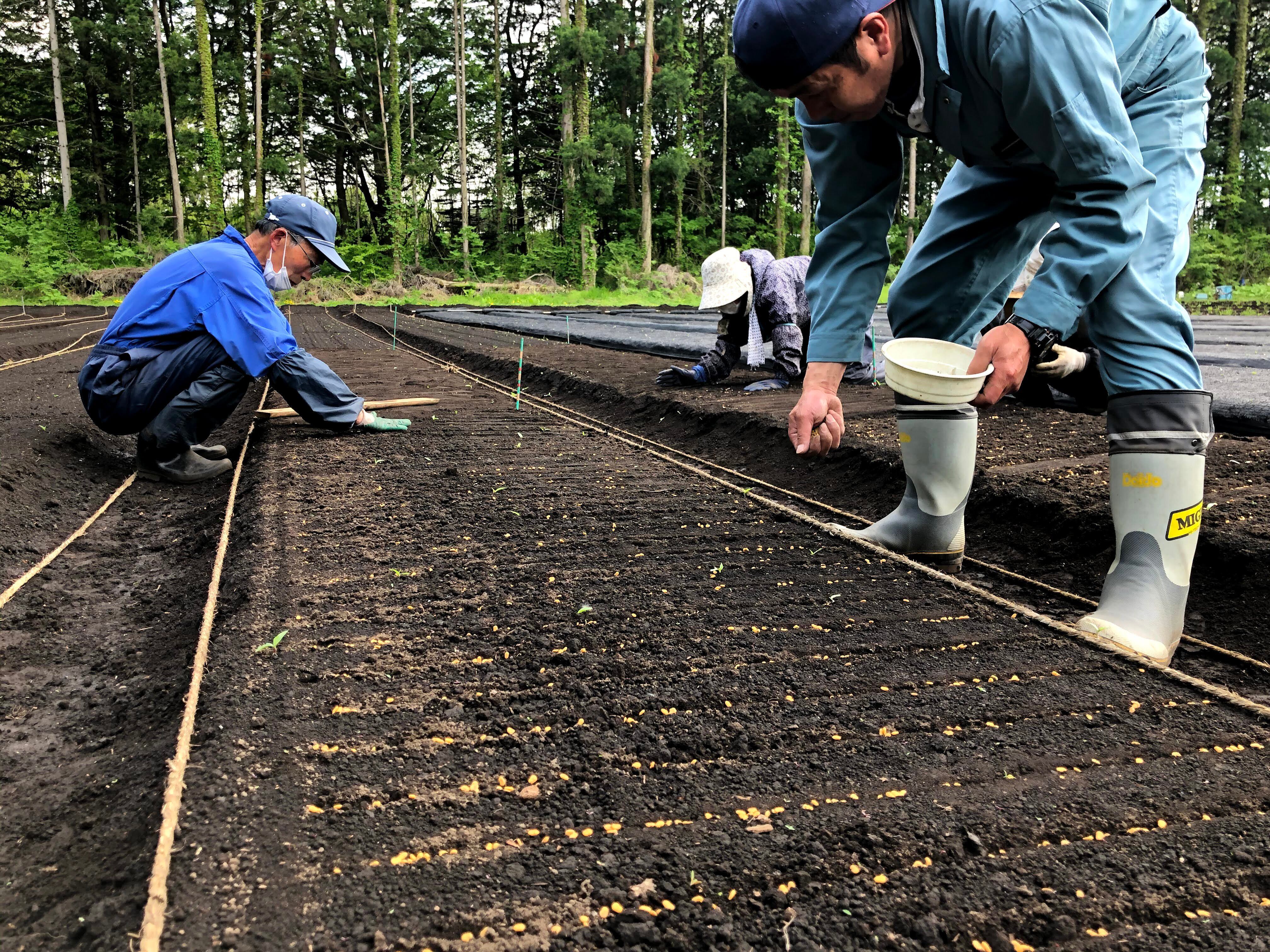 唐鍬などで10センチ程度の深さに土を掘り、苗を置きます。その際、苗の先を手で、根は軽く足で押さえてまっすぐに植えます。